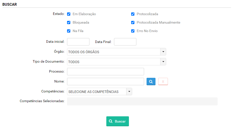 Selecione as competências que você deseja filtrar as protocolizações. Utilize esta opção para refinar sua pesquisa de acordo com as áreas de atuação desejadas, garantindo resultados mais específicos.