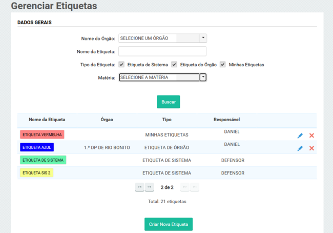 Após a busca pelas etiquetas serão listados os resultados logo abaixo com as informações de nome da etiqueta, órgão vinculado, tipo, e responsável.