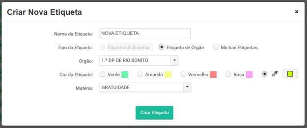 - Órgão: Essa etiquetas ficarão disponíveis para uso por todos os usuários lotados naquele órgão.
