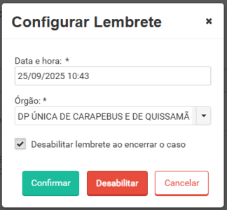 É possível desabilitar o lembrete clicando novamente no ícone correspondente e selecionando a opção desabilitar, que será precedido de um pedido de confirmação.