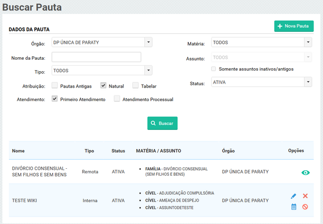 • Ao desativar a pauta ela não estará mais disponível para novos atendimentos;