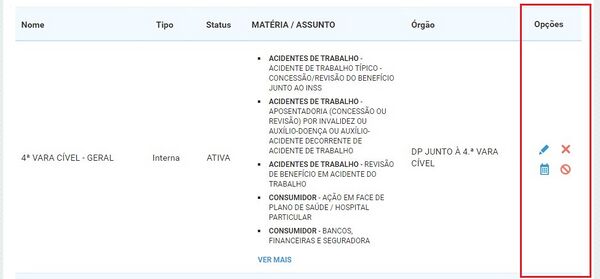 • As matérias e assuntos disponíveis serão filtrados de acordo com as matérias e assuntos do órgão e a atribuição definida.