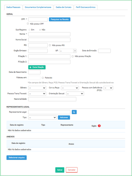A primeira aba são os dados pessoais do(a) assistido(a), nome e nome social, CPF, as informações sobre o RG, nome dos pais, data de nascimento, se é falecido ou não, bem como a data do óbito, gênero, cor ou raça e nacionalidade. Ainda nessa aba é possível declarar o(a) representante legal e o tipo se for o caso, bem como anexar documentos pertinentes ao assistido(a).