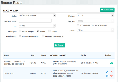 Ao clicar em menu ⇒ pauta o sistema exibirá todas as pautas criadas para o órgão, sejam elas internas, externas ou remotas. Além de alguns filtros para busca de pautas especificas